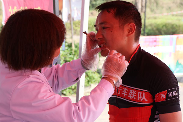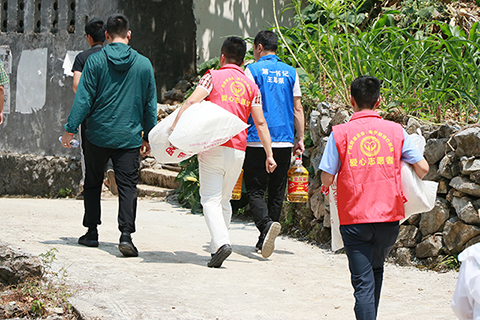 马山县古寨瑶族乡龙林村位于南宁北面的一个偏僻农村,贫困户家庭住址交通不便,道路崎岖,身着红衫的南宁脑博仕医院爱心志愿者们走在乡间的小路上,显得特别的精神。
